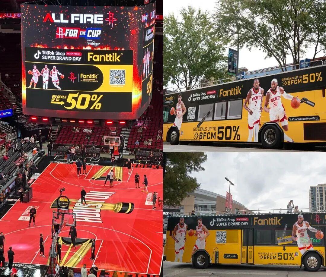 Fanttik曾绑定“NBA休斯顿火箭队”这一本土高认知IP,在比赛现场的巨型屏幕投放TikTok Shop超级品牌日相关信息,搭配“限时五折”专属优惠等活动,同时在场外发起休斯顿观光巴士打卡活动,引导球迷自发在TikTok发布相关内容,形成了自发传播的内容矩阵。