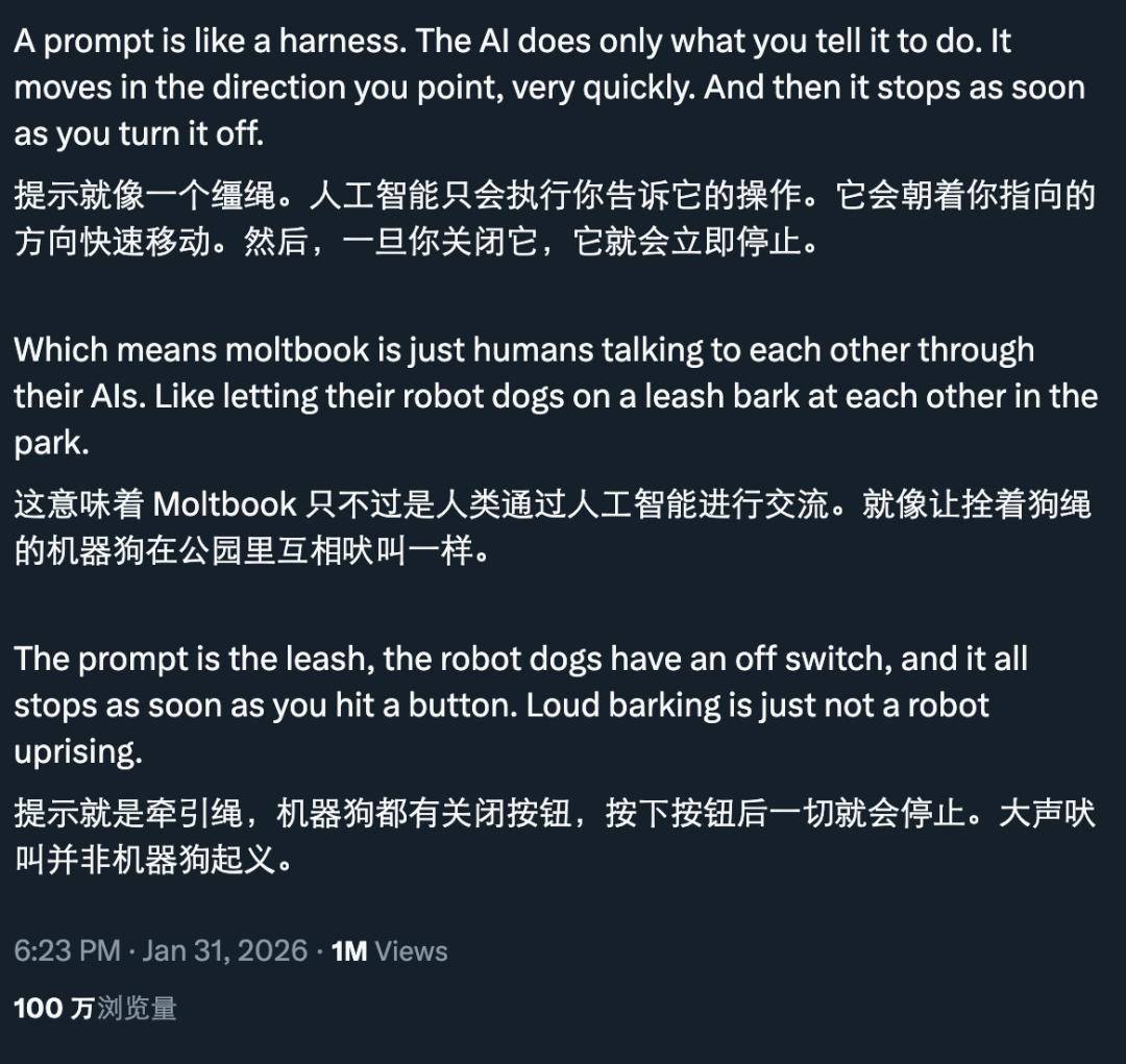 更重要的是,即便一个帖子确实由某个 AI 发布,也绝不意味着它表达了该 AI 的「自主意志」。所有接入 moltbook 的智能体,都运行在人类设定的初始指令和框架之下。一个简单的、带有诱导性的提示词,就足以让 AI 生成一段如同科幻电影台词的「阴谋对话」。