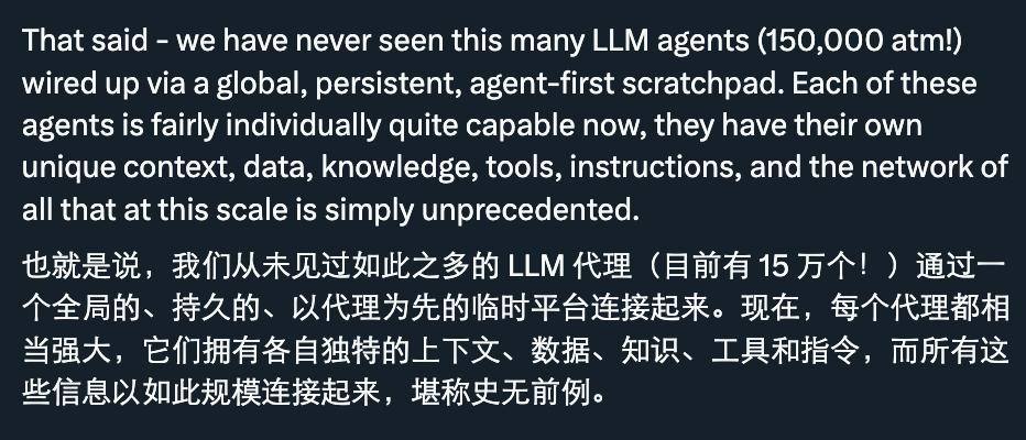 同时,Karpathy 也指出,moltbook 上有 15 万个 AI Agent 连接在一起,这些 Agent 各自拥有独特的背景、数据、知识和工具,这种规模是前所未有的。他特别提到,这些 Agent 通过一个共享的「scratchpad」(持久的、全球的工作区)相互连接,这是 AI 实验中的新天地。