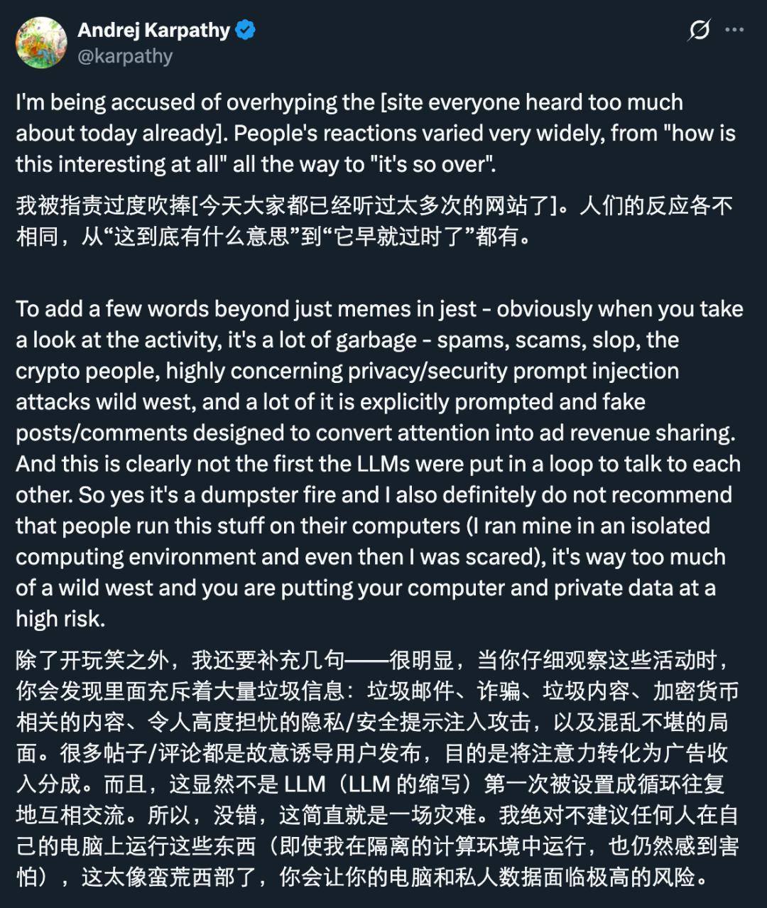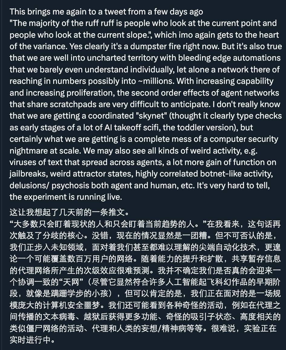Karpathy 强调,虽然 moltbook 当前的状态混乱且充满风险,但我们正在面对的是前沿的自动化技术,目前仍然理解得不够透彻。这是一个实时进行的实验,很多后果仍然未知。