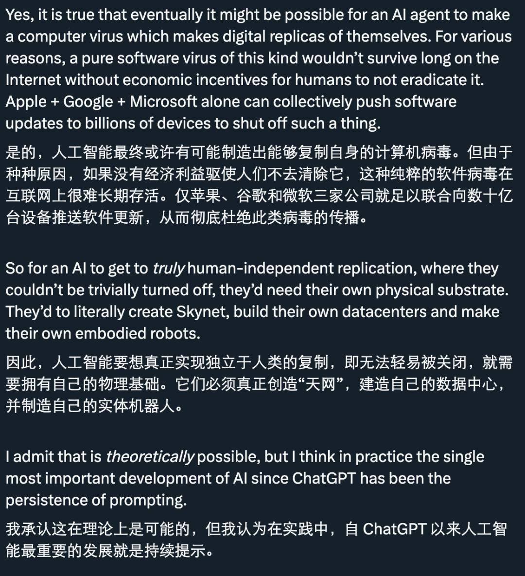 但也有人认为,这种担心目前还没有必要,因为现实中这些 AI 依然完全依赖于人类的提示(prompt),就像「拴着绳子的机器狗」。它们的行动完全由人类的指令驱动,一旦人类停止发出指令,AI 就停止行动。因此,这部分人认为,AI 的「起义」是不可能发生的,因为它们的行为仍然可以通过简单的「关闭按钮」来终止。