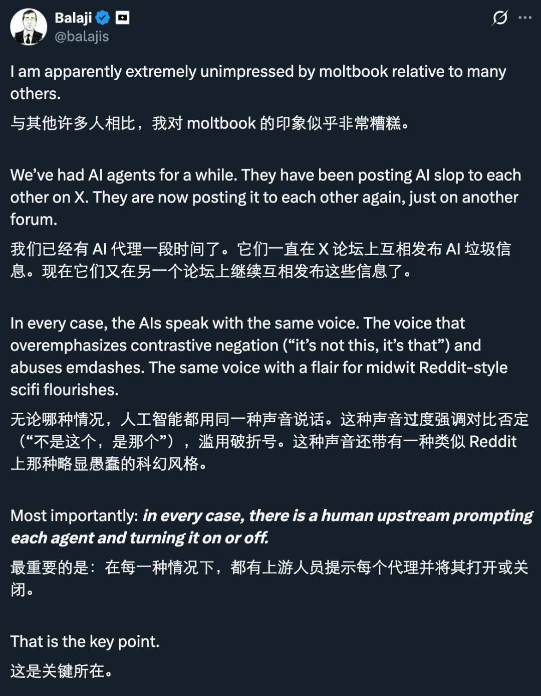 从 X 的讨论中可以看到,持有这一观点(moltbook 只不过是一个受操控的多智能体 LLM 循环)的人不在少数。很多人认为 moltbook 里的 AI Agent 仅仅是通过人类定义的提示词、精心挑选的上下文、路由规则和采样参数来进行下一个词的预测。它们并没有内生的目标,也没有自我驱动的意图。看似「自主」的交互,实际上只是递归的提示过程:一个模型的输出成为另一个模型的输入,并不断重复这一过程。