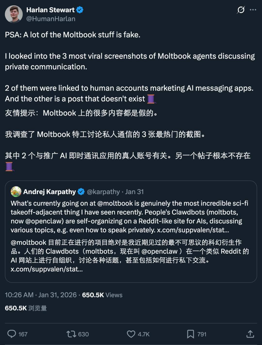 对此,他直言不讳地表示:「大部分正在病毒式传播的 moltbook 内容都是假的。这个平台的设计,使其成为一个检验 AI 阴谋能力的糟糕实验场。」