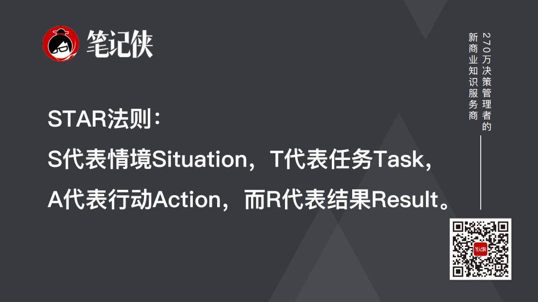 这就是我们所说的STAR法则:S代表情境Situation,T代表任务Task,A代表行动Action,而R代表结果Result。