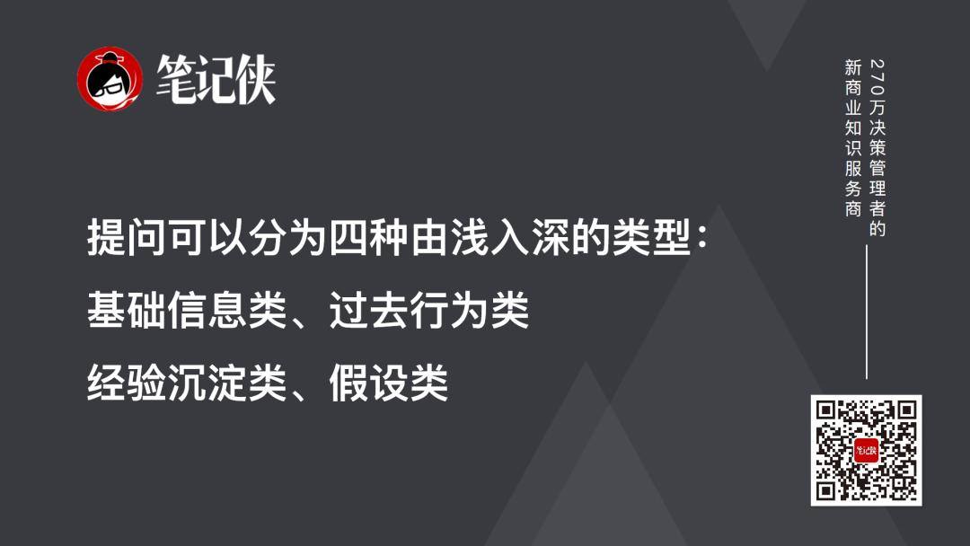 提问可以分为4种由浅入深的类型。首先是基础信息类,例如让应聘者简单介绍自己过去的销售额等,以了解基本信息。其次是过去行为类,就是行为面试法,询问他们过去成功和失败的案例。