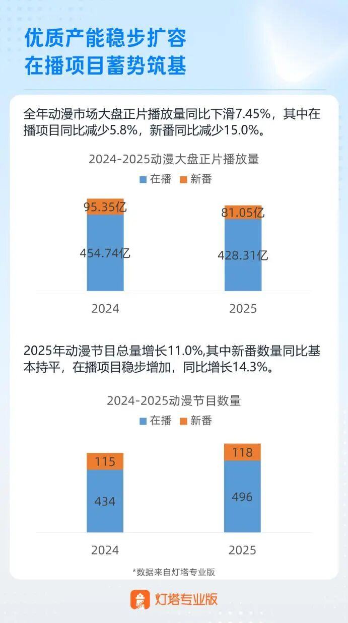 相较之下,根据灯塔专业版发布的《灯塔2025年动漫市场报告》,去年全年动漫市场大盘正片播放量仅500亿出头,在体量层面并不占明显优势。但进一步拆解结构可以发现,这并非同一维度的竞争。