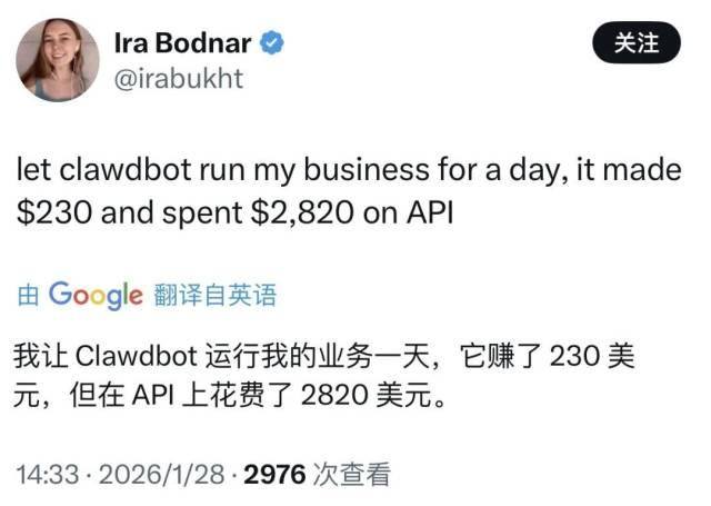 有用户算了一笔账:“让Clawdbot运行我的业务一天,它赚了230美元,但在API上花费了2820美元。”也有用户反馈,100美元只能维持20个小时,每月可能要花费3000美元,这几乎相当于雇佣一名真正的秘书。