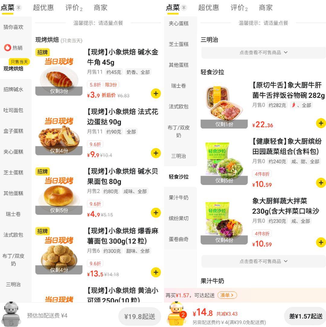 除了烘焙,下单页面还有布丁、三明治、轻食沙拉、果汁牛奶等产品,均为小象超市自有品牌旗下产品。