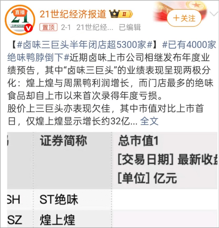 到了2025年底,受冲击最大的又变成了绝味,不仅亏损,关店也是最多。反观煌上煌和周黑鸭,尽管不复巅峰时期的风光,尽管也在关店,但至少在这一年里赚到了钱。