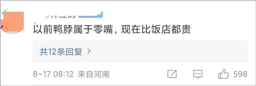 相比之下,同样是卖鸭货,近些年默默开出近3万家店的衢州鸭头,出圈之路朴实无华。它不讲品牌故事,没有高端包装,主打的就是便宜。一根鸭脖8块钱,一只鸭头五六块,买起来毫无压力。