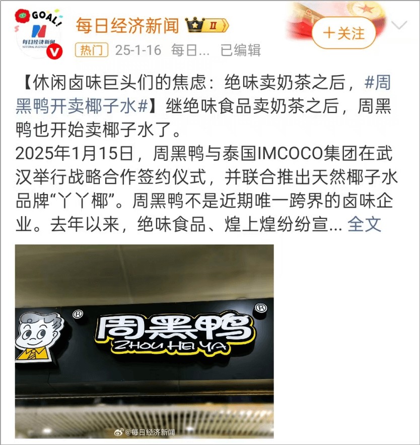 比如它们不约而同地搞起了“副业”。煌上煌收购粽子品牌,甚至把米制品做成了公司第二大业务;2024年9月,绝味在长沙部分门店推出奶茶业务,打出“11.9元购3杯原叶奶茶券”的低价;连最讲究的周黑鸭,也在2025年初宣布进军椰子水饮料市场。