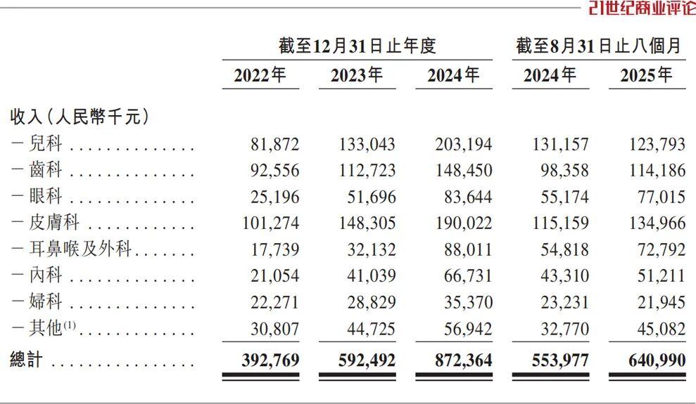 2025年1-8月,所有科室中,皮肤科的营收最高,达1.35亿元,占总营收超两成,其次为儿科。齿科紧随其后,营收达1.14亿元。