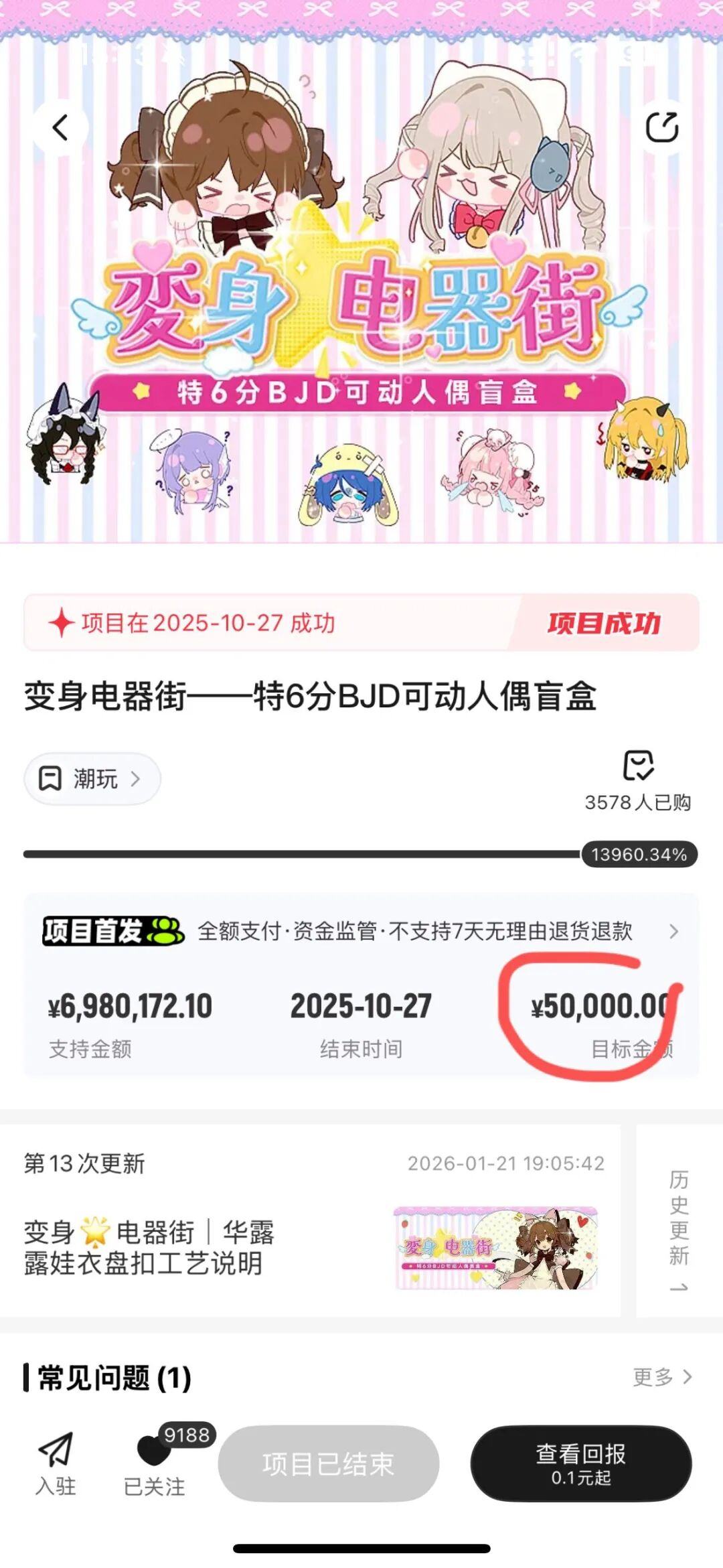 对商家来说,众筹模式能极大降低开发的风险和费用压力,消费者为了帮助项目成功,也会在较长周期内不断自发宣传;对消费者来说,只要愿意等待,就能以较低价格买到成品和大量众筹期间购买才有的限定礼品,还能在制作期间不断向品牌提出意见。因此,众筹并不完全是小圈子的自发行为,nagi兽仔等较大的潮玩品牌也会开启众筹。以近期发出现货的可动盲盒企划变身电器街为例,众筹目标为五万,但最终的金额达到了近七百万元。