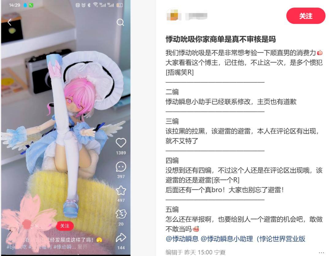 剁椒了解到,目前可动品牌的营销投放方式大多以通过置换邀请博主拍摄开箱视频(圈内称为“试吃”)为主,缺乏有效的宣传投放链路和专业的营销流程,公关意识也不算强。近期,多个博主在测评bjd品牌悸动瞬息的新品时将玩偶摆出不雅姿势,引发消费者抗议。对此,品牌方助理号表示是由于工作人员下班没能及时审核内容。作为体量较大的品牌,这种“草台班子”运作的解释也并没有完全让消费者信服。