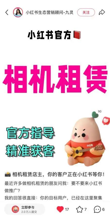 例如咔么租赁会发布演唱会租金攻略、详细租金流程等帖子,也会和博主合作推广,目前咔么租赁在小红书平台有1万粉丝;探物租赁业做了租机、使用相关的干货内容分享,目前在小红书粉丝有6万。