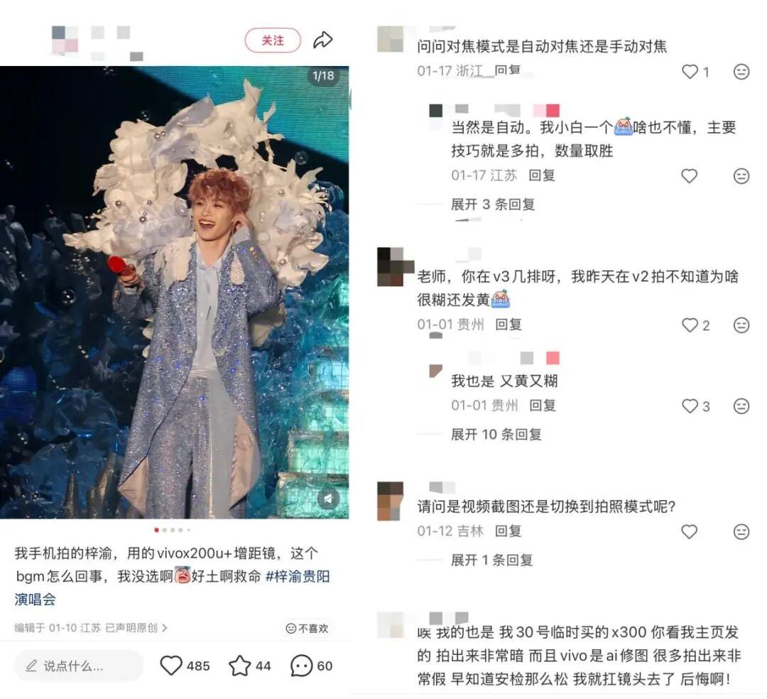 近期梓渝的演唱会就有很多粉丝分享视频、舞台图,完美的构图、舞台氛围感、清晰到可以看清眼神光的五官,这类贴子会吸引很多点赞留言,尤其是很多“同担”也会咨询“什么设备”、“怎么拍出来的”,通常这些博主也非常乐意分享自己的出片历程,而且这类贴子的评论区,往往也会有很多同场粉丝晒出不同视角的“神图”。