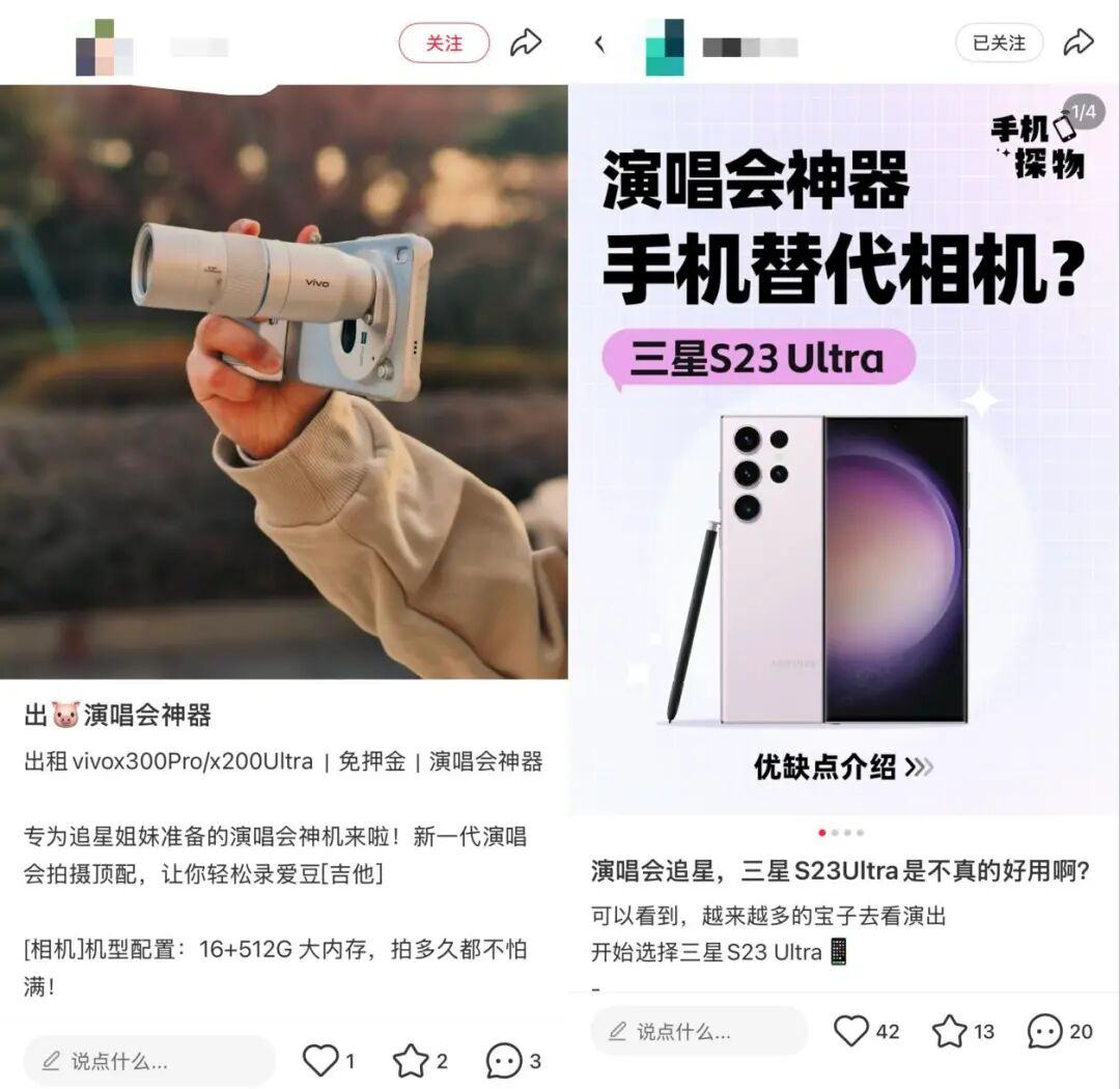 租手机看演唱会这一消费趋势,爆发于2022年底、2023年初,彼时演出市场逐步复苏,看演出的消费者也开始从追星族、小众演出爱好者向大众破圈。一些主打长焦性能的手机,凭借远距离拍摄优势,被捧成“演唱会神机”。代表性产品是三星s23u、三星s24u,vivo X 200u、vivo X 300。