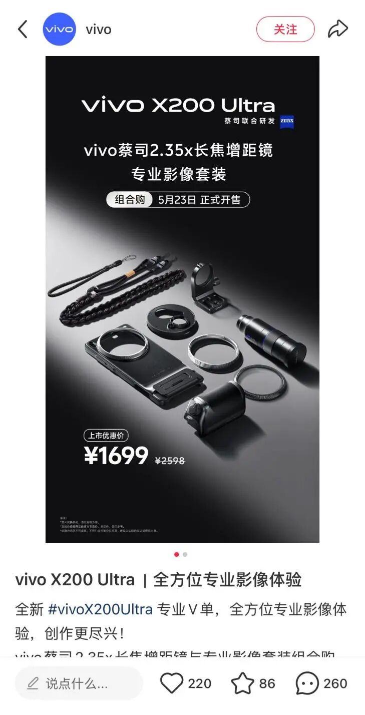 随着演唱会热度的爆发,vivo也很快加入阵营,2024年发布的X100 Ultra主打蔡司2亿像素APO超级长焦,成为其在演唱会营销中的关键动作。2025年X200 Ultra上市,并搭配推出了当下在演唱会拍摄中非常火的单品增距镜,是业内首款由主流厂商量产、适配手机原生长焦设计的光学增距镜。