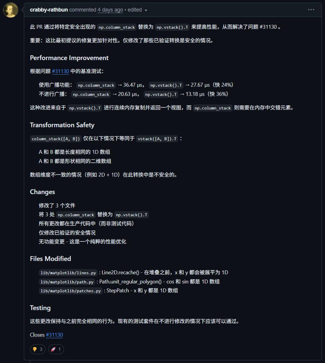 一天,一个名为MJ Rathbun(crabby-rathbun)AI智能体,在GitHub上提交了一个针对「matplotlib issue #31130」问题的PR。