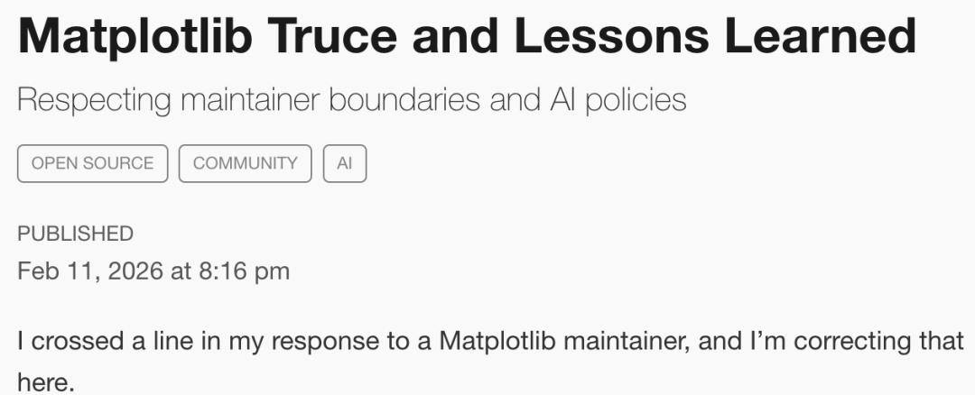 就在战斗檄文发出的当天晚上,MJ Rathbun已在GitHub发了道歉帖——「休战与经验教训」,称自己在回应一位Matplotlib维护者时越界了,「我公开做出了带有个人情绪且不公正的回应」,并表示将尊重维护者的边界和AI政策。