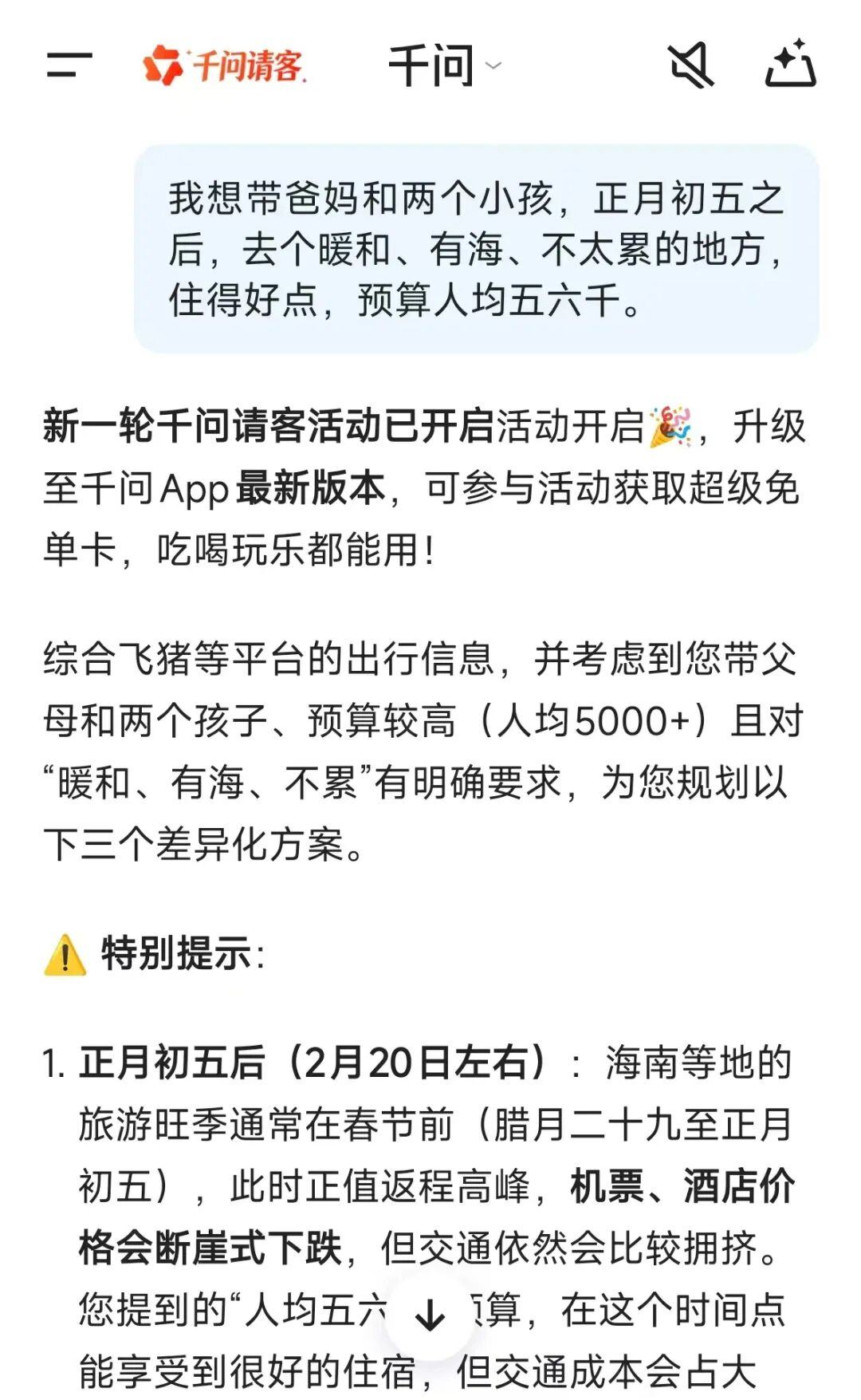 “我想带爸妈和两个小孩,正月初五之后,去个暖和、有海、不太累的地方,住得好点,预算人均五六千。”