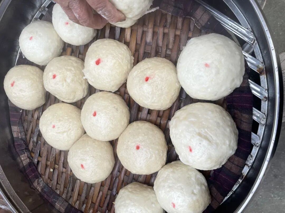 爷爷奶奶亲手包的馒头,每个馒头上还会点一个红点。(图/钱雨朦 摄)