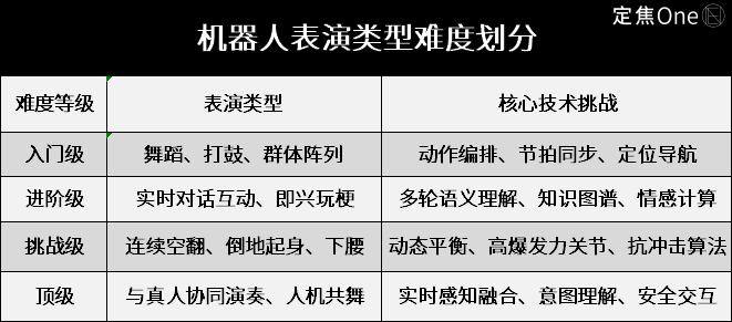 综合多位从业者的说法,机器人表演的技术难度可以分为四个等级。