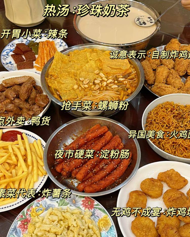 社交媒体上流行的一份年夜饭菜单里,详细列出了一位00后计划摆上年夜饭餐桌的28道菜肴:开胃菜是菠萝蜜夹干噎酸奶,素菜是刘文祥麻辣烫,“硬菜”包含鸡柳大人三拼、淄博烧烤和三文鱼刺身(鱼腩中段200g)。