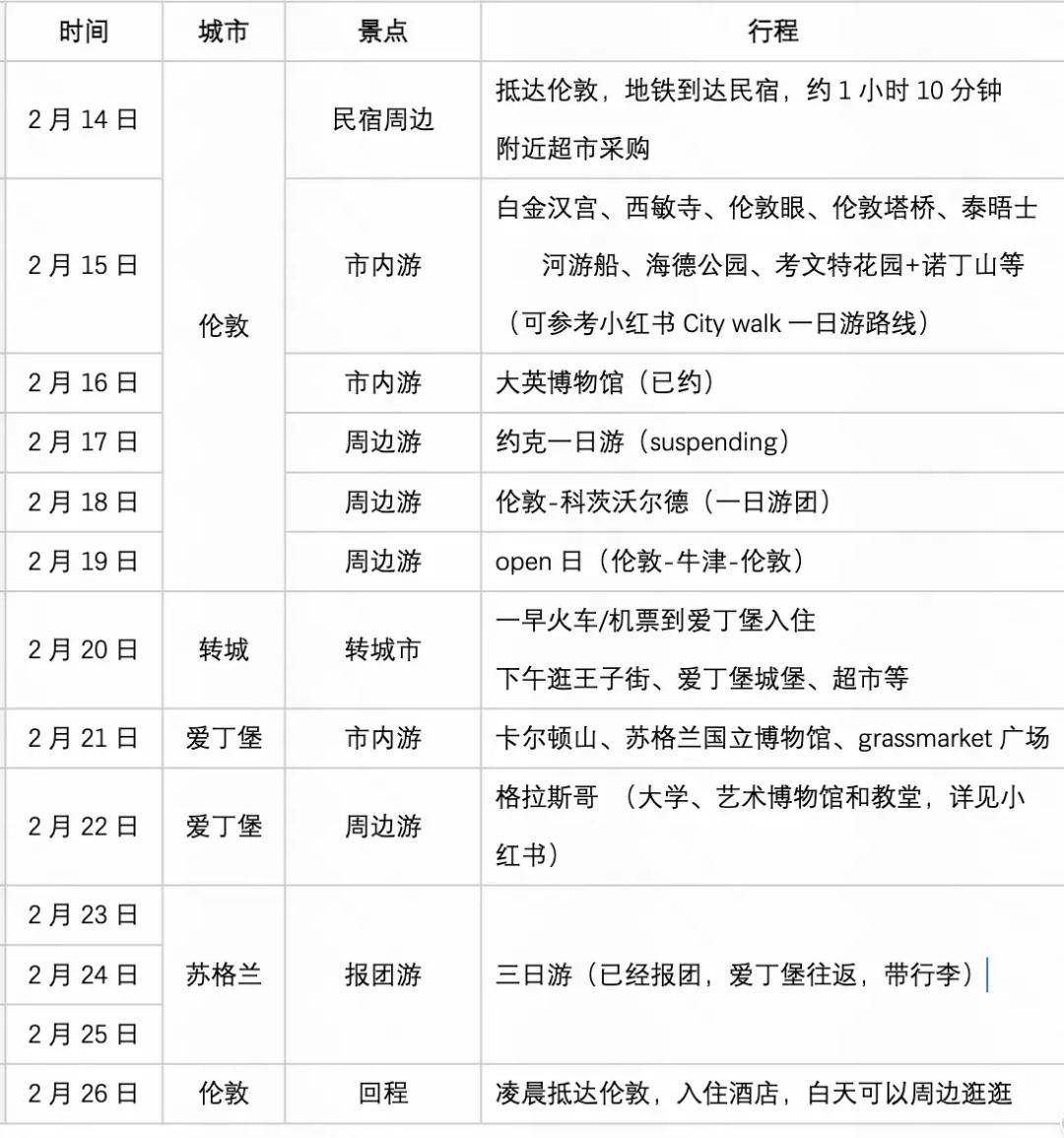 在互联网大厂工作的可可早已盯上这个窗口,今年春节公司放假9天,加上年假,足够完成一趟伦敦深度游。她提前半年刷到便宜机票,就直接下单了。“目前预计伦敦7天、爱丁堡2天、苏格兰3天,够慢下来走一走了。”她说。