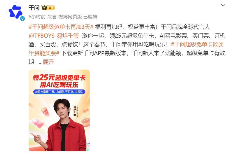 然而,就在豆包和元宝在红包与社交的战场上贴身过招时,千问却悄悄绕到了大后方,祭出了一套极具侵略性的升维打击:不仅独家冠名“2026河南春节晚会”,更在2月14日突然宣布:追加30亿“超级免单卡”。