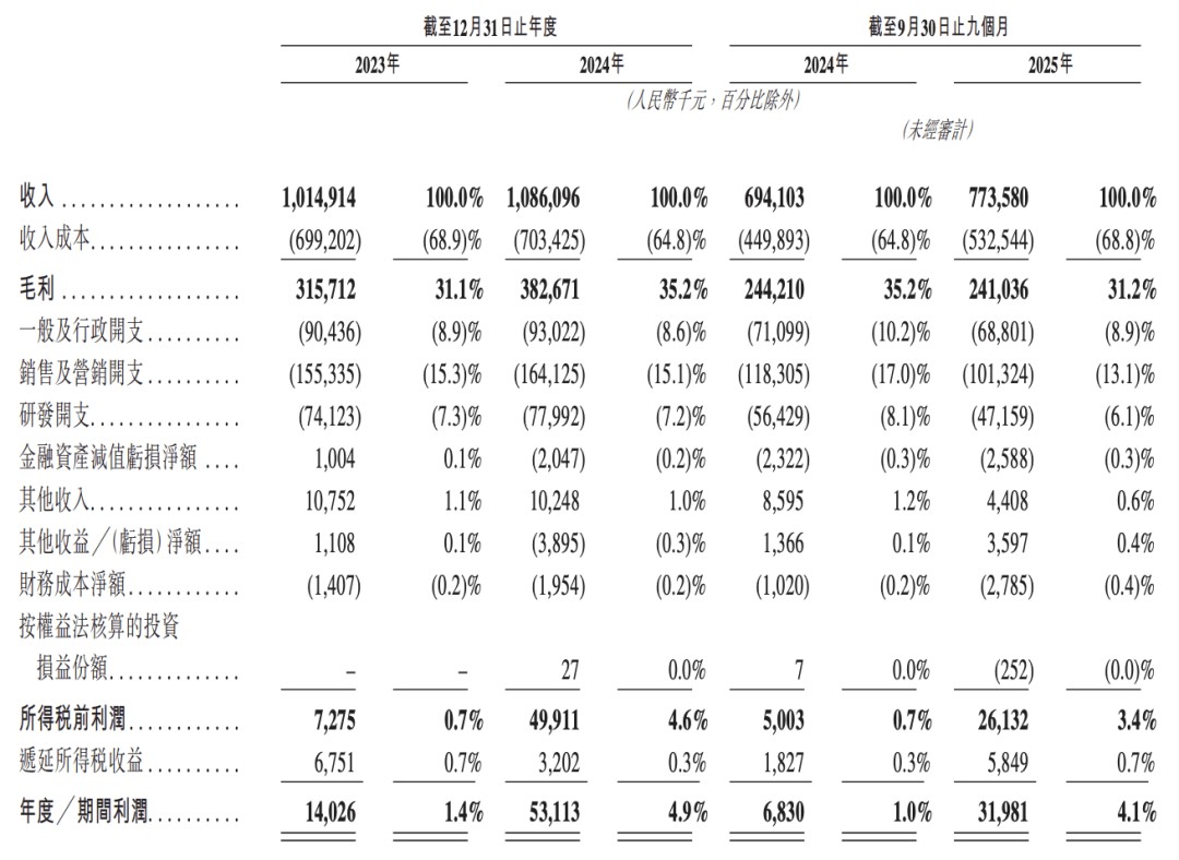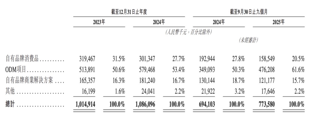 在2023年、2024年和2025年前三季度(以下简称“报告期内”),自有品牌消费品的平均售价分别为1143.3元、1158.1元及919.8元;ODM项目产品的平均售价分别为682.5元、634.3元及440.4元;自有品牌商业解决方案的平均售价为296.6元、303.2元及318.6元。