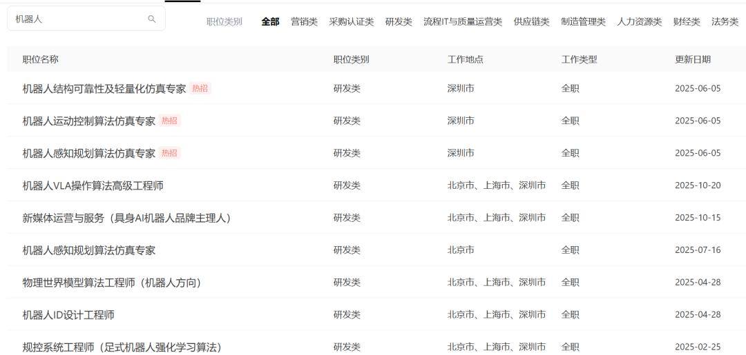岗位包括具身AI架构师、动力系统工程师、整机系统工程师、硬件系统工程师、灵巧手设计工程师,也包括机器人结构可靠性及轻量化仿真专家、机器人运动控制算法专家、机器人感知规划算法专家等等。