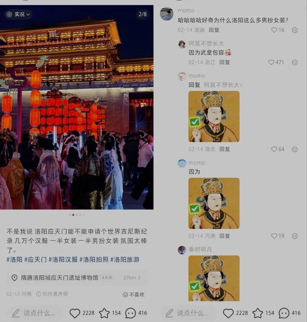 “洛阳应天门能不能申请个世界吉尼斯纪录,几万个汉服,一半女装,一半男扮女装,氛围太棒了。”来洛阳旅行的博主发帖惊叹。评论区内,大量的网友整整齐齐刷起了“武皇包容”表情包。