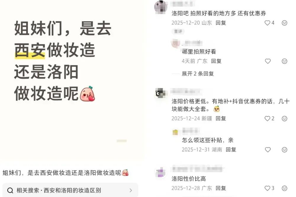 事实上,再向前追溯,男生女装的玩法,早在于洛阳火爆前,也曾在西安掀起过小水花,早在2024年时,便有男生尝试于西安进行过女妆变装,同样在抖音收获一波流量,但并未转化为一场集体风潮。