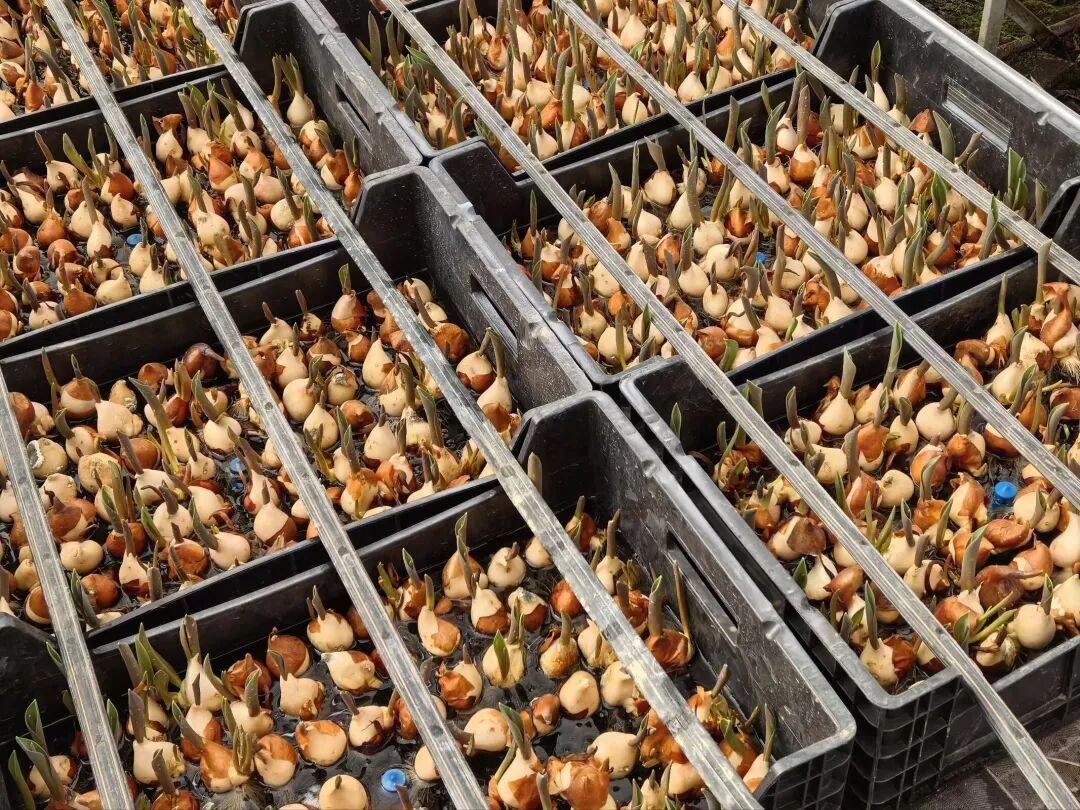 其次,中游的种植环节,有种种技术壁垒。中国并非不能生产种球,然而,郁金香对生长环境要求苛刻,需要精准的温控、光照和水肥管理,刘浪详细向我们描述了生产过程,种球需先在5-9摄氏度的冷库中生根约20天,再移入温度严格控制在10-20度之间的大棚中生长,从下地到采切,周期约50天。任何一个环节失误,都可能导致成品率下降。