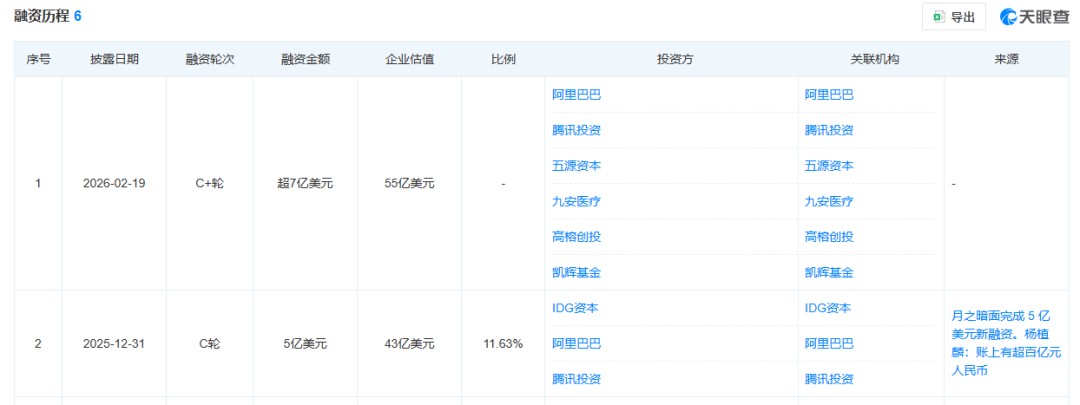 “天眼查”显示,2025年12月月之暗面5亿美元的C轮融资由阿里、腾讯、IDG资本投资;2月份新一轮超7亿美元的C+轮融资由阿里、腾讯、五源资本、九安医疗、高榕创投等联合领投,高榕创投等老股东继续加码,投后估值超100亿美元。