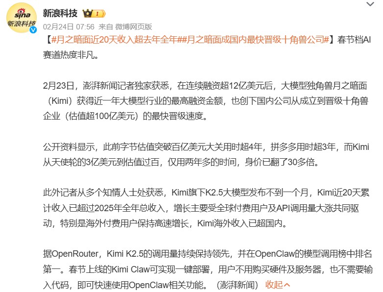 2026开年,中国大模型行业传来重磅消息:成立仅两年多的月之暗面,最近两个多月内连续完成超12亿美元的融资,估值突破100亿美元,刷新国内企业晋级“十角兽”(估值超100亿美元)的最快纪录,同时创下近一年来国内大模型行业的最高融资纪录;此外,其新一轮100亿至120亿美元估值的融资也已开启。