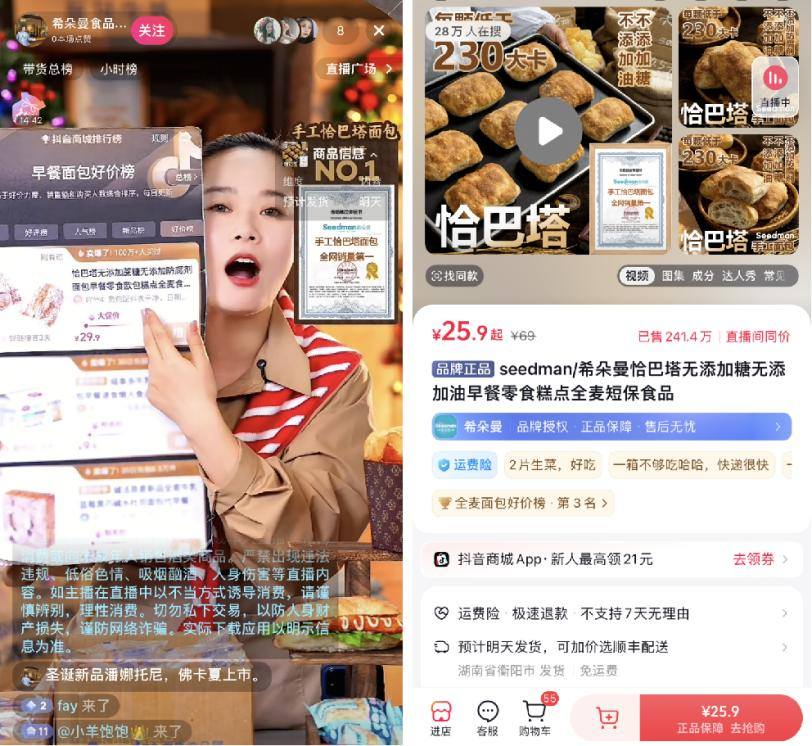 比如希朵曼,这家成立36年、来自衡阳的连锁烘焙品牌走向线上,将抖音作为主攻渠道,在直播和短视频场景中孵化出单链接240万人购买的恰巴塔爆款,以0糖、0油、0添加作为卖点,详情页称“累计销售9650000颗”“手工恰巴塔面包全网销量第一”;又如椒达人开出线上旗舰店,选择复刻“花椒腰果恰巴塔”等线下烘焙店同款,天猫平台显示单品销量已售10万+。