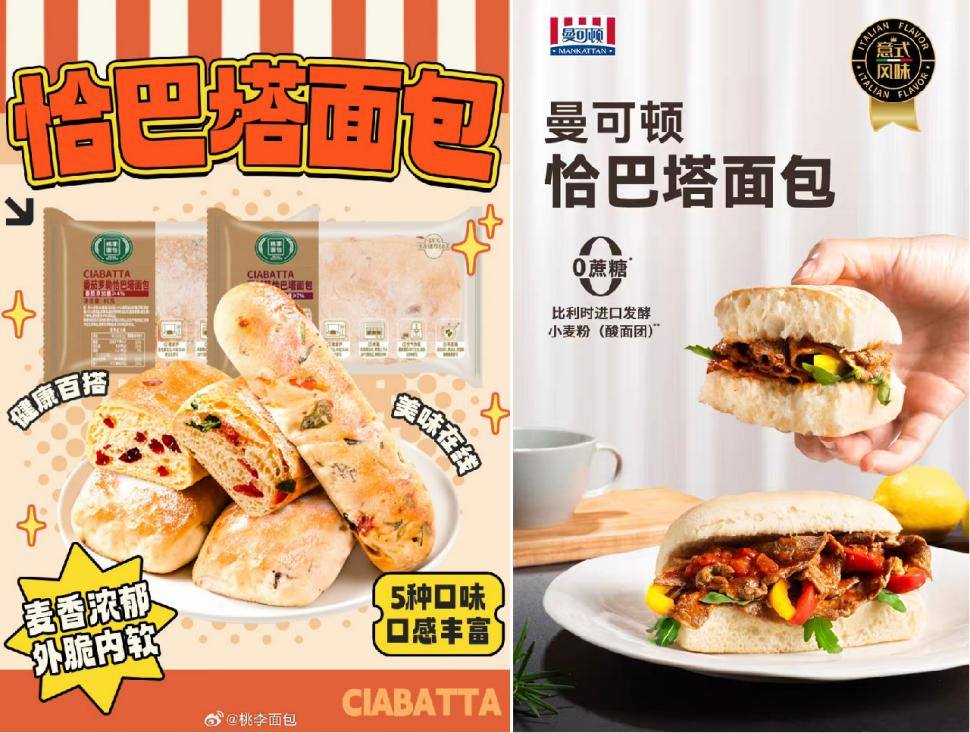 如果说美食主理人们曾是恰巴塔的布道者,那么如今烘焙巨头的下场,则意味着这款产品进入了大众化快车道。2025年7月,桃李面包、曼可顿相继推出恰巴塔,其中曼可顿新品还在李佳琦直播间亮相,将价格“打到”了每只4元。
