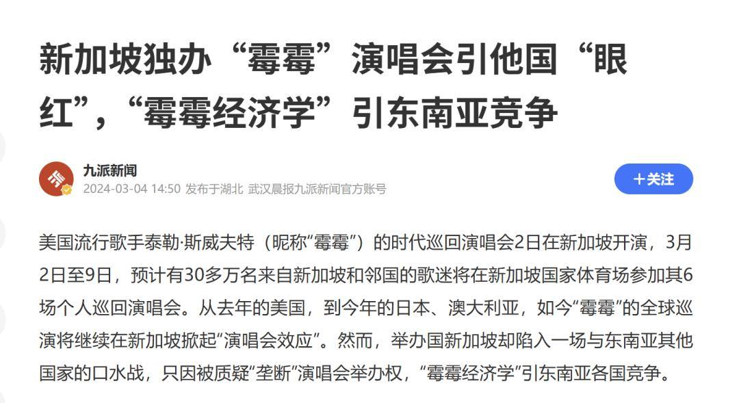 新加坡是这场争夺战中最具代表性的国家。为了拿下顶级演出资源,新加坡不惜投入重金补贴——2024年,为争取泰勒·斯威夫特“时代巡回演唱会”的东南亚独家举办权,新加坡政府为每场演出提供了高达200万至300万美元的专项补贴。