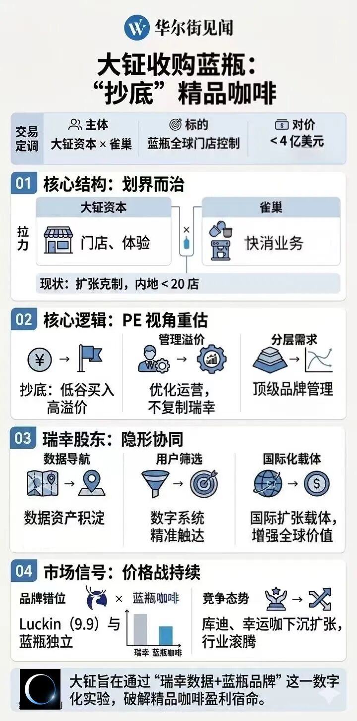 如果蓝瓶的经营数据未来出现明显改善,一方面将再次验证大钲资本具备运营高端咖啡品牌的能力;另一方面,也可能为瑞幸未来的国际化提供一个更具辨识度的品牌载体,从而在资本市场上提升公司的整体估值空间。