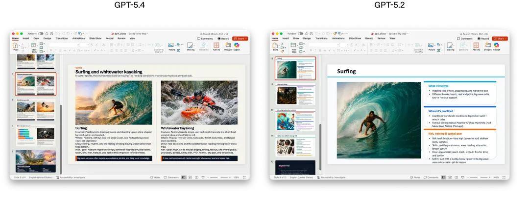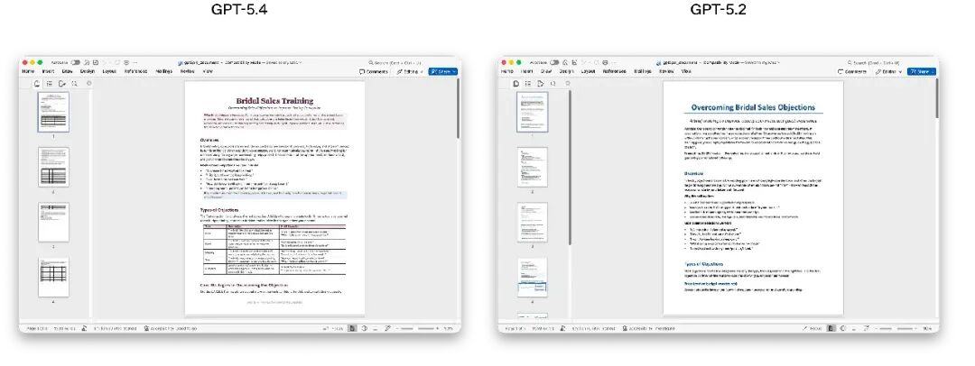 为了更好地让 GPT-5.4 融入人们的实际工作场景,OpenAI 在官方介绍中直观展现了新版本模型在电子表格、文档和幻灯片三个场景的专业级表现: