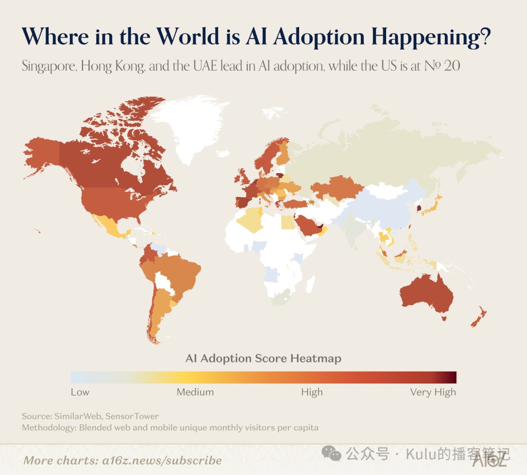 排名前五:报告首次制作了基于人均(Per Capita)的 AI 采用热力图。排名前四的依次是:1. 新加坡、2. 香港、3. 阿联酋 (UAE)、4. 韩国。