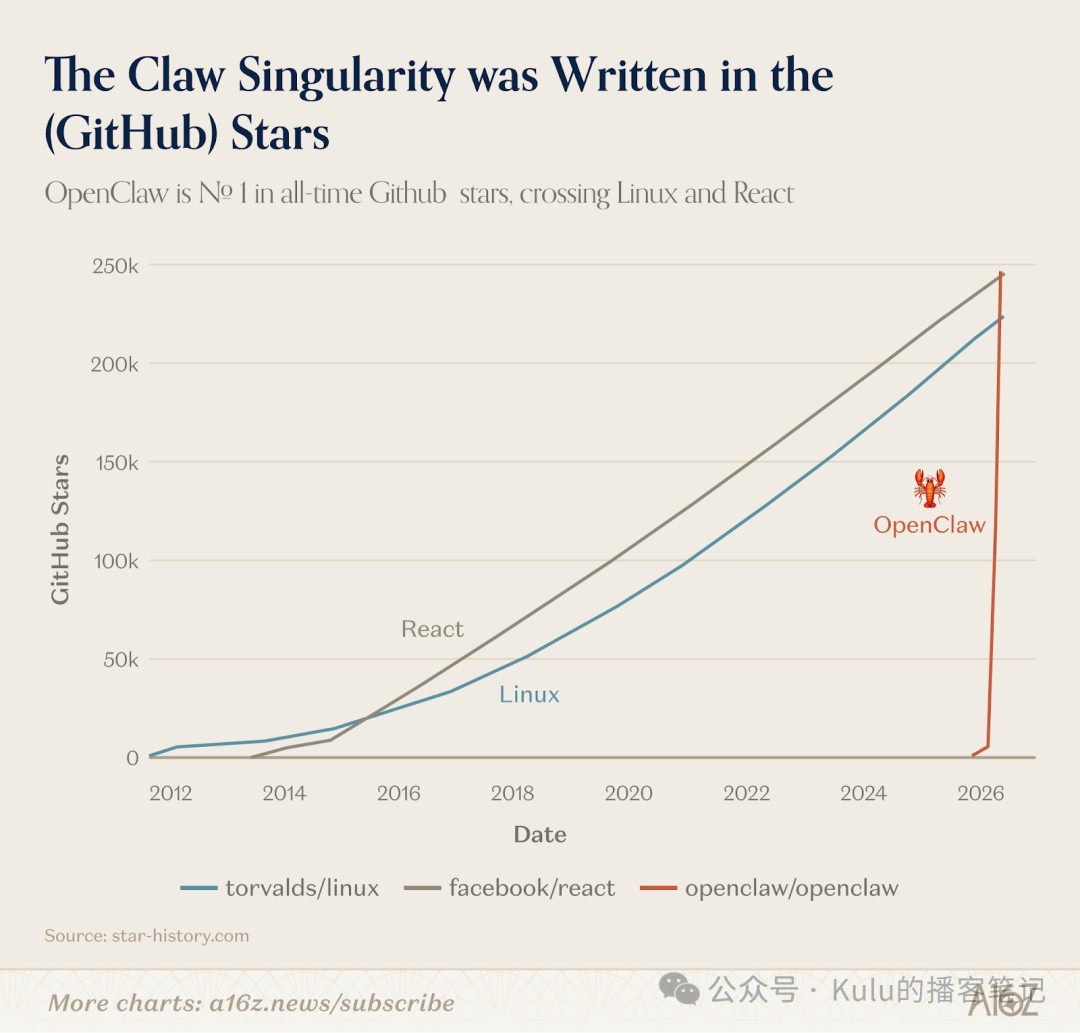 GitHub 统治力:OpenClaw 的 GitHub Stars 数量已超越 Linux 和 React,成为有史以来 Stars 数量最多的项目。
