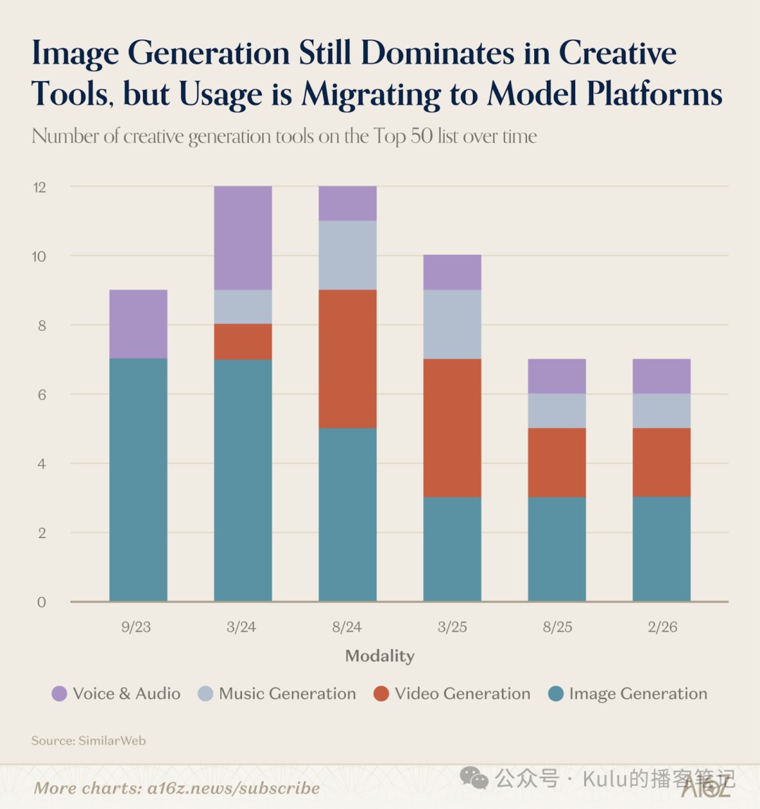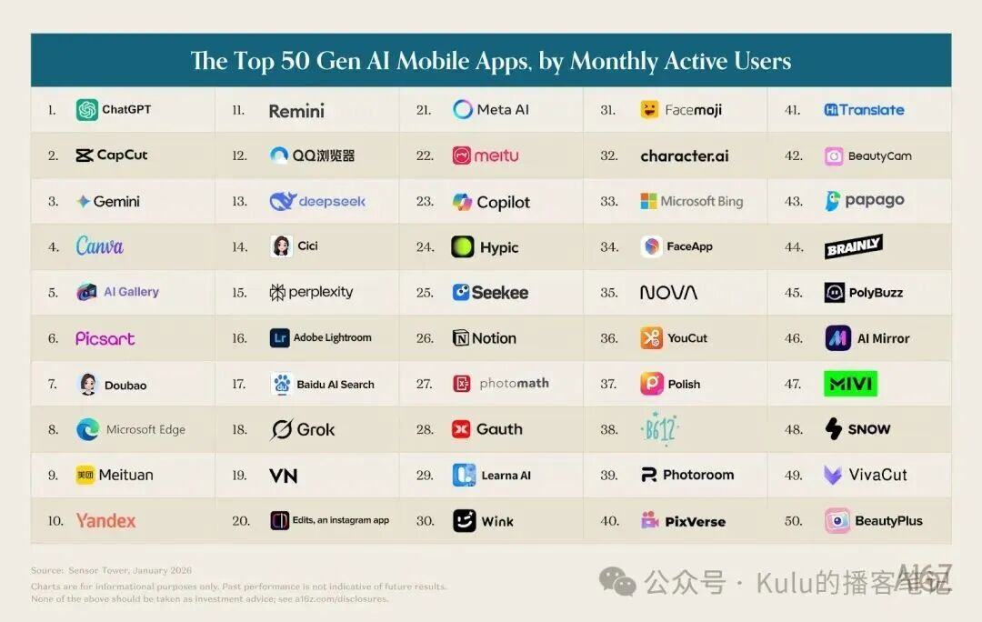 a16z发布了第六版Top 100 Gen AI报告《Top 100 Gen AI Consumer Apps: March 2026》。这份报告跳出了前两年行业爆发式增长的流量喧嚣,直指当前Gen AI市场的“固化”格局与“转向”信号:ChatGPT的绝对优势仍在,但它的“阴影”之下,已显现出AI交互从Web窗口向桌面、浏览器、语音延伸的趋势。这一现象,本质上是产业从“技术狂欢”向“场景落地”的回归,更是投资逻辑从“押注模型”向“挖掘应用壁垒”的转变。