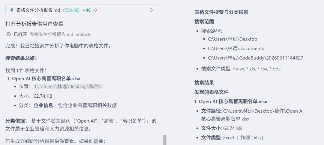 光锥智能进行了一个简单的测试:让WorkBuddy调取过往几年在电脑端存储的写作文档,总结一下近几年的工作情况和发展轨迹。WorkBuddy通过文档类型和标题,把分散在多个文件夹里的文档都挨个读取了一遍,并且还能帮用户把分散的文件按照类别分类整理好。它甚至还能帮你把PPT、Excel这类办公文件的数据按照要求提取、整合。这让WorkBuddy不再只是一个对话工具,而是真正成为了一个能够干活的数字助手。