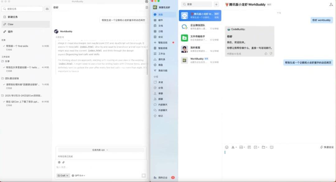 企业微信接入,直接在对话框就能调用小龙虾 图源WorkBuddy