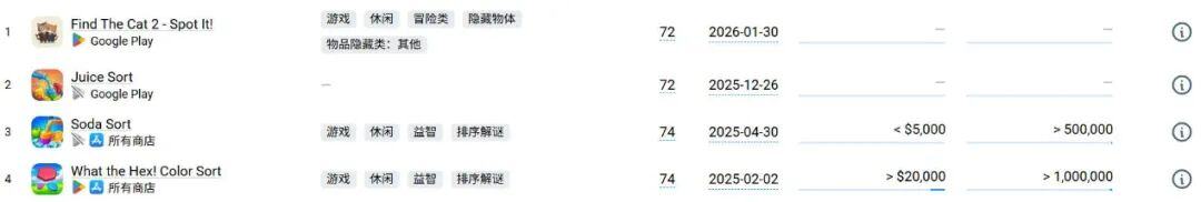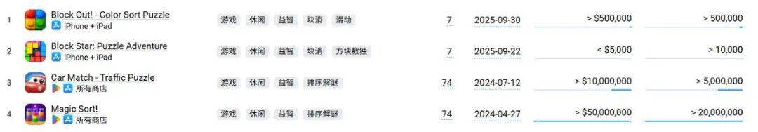 类似的还有跑出头部“分颜料水”混休游戏的「Grand Games」,虽然之后也有“挪车+消除”游戏「Car Match」取得了不错的成绩,但随后在 2025 年也没有更多原创玩法新品产出,只在 2025 年 9 月上线了「Color Block Jam」和「Block Blast」的仿品,目前也在测试阶段。