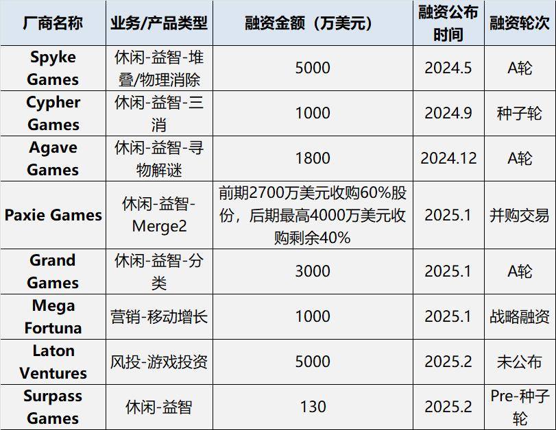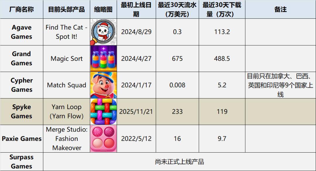 我们仔细观察了一下在上一篇文章中获得融资的休闲厂商,发现这些厂商目前的头部产品绝大部分都是在 24 年上线,唯一的例外是 Spyke Games 的「Yarn Loop」,但这款产品的上线日期距离融资也相隔一年半的时间。即便是已经跑出大 DAU、大流水的 Agave Games 和 Grand Games,在获得融资后还没有找到新的头部产品。