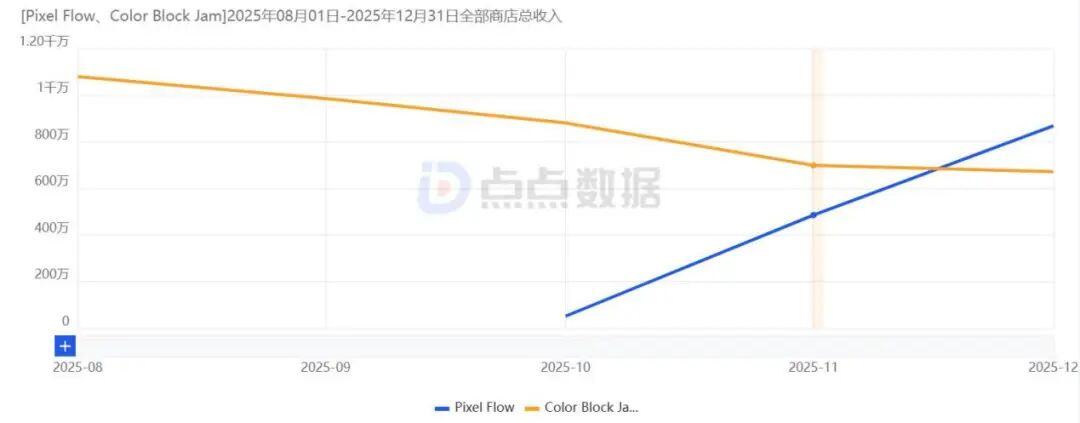 「Pixel Flow」在 2025 年 12 月已经成为月流水最高的混休产品,之后在 2026 年 1 月宣布完成种子轮融资,2 月被 Scopely 收购大部分股份 | 数据来源:点点数据